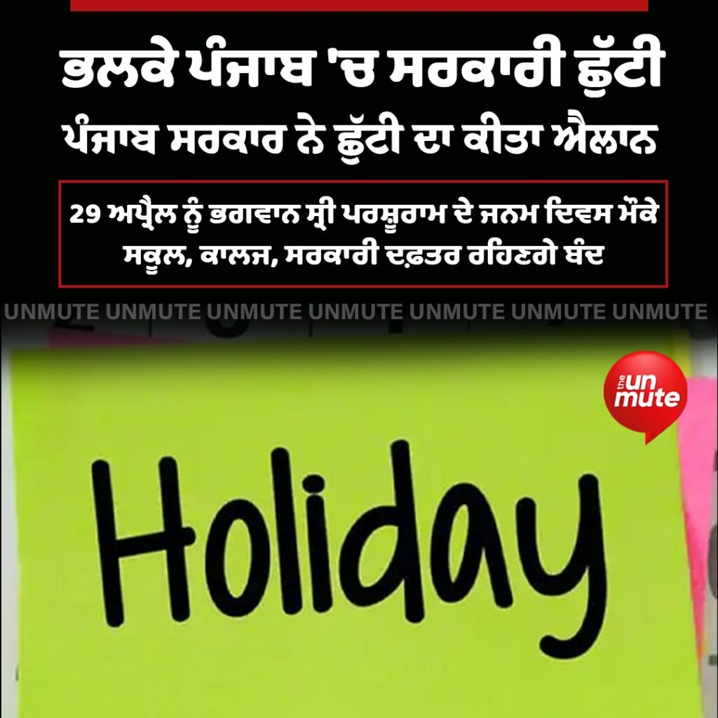 28 ਅਪ੍ਰੈਲ 2025: ਪੰਜਾਬ ਵਿੱਚ, ਕੱਲ੍ਹ ਯਾਨੀ 29 ਅਪ੍ਰੈਲ (ਮੰਗਲਵਾਰ) ਨੂੰ ਸਰਕਾਰ (sarkar) ਵੱਲੋਂ ਜਨਤਕ ਛੁੱਟੀ ਘੋਸ਼ਿਤ ਕੀਤੀ ਗਈ ਹੈ।
