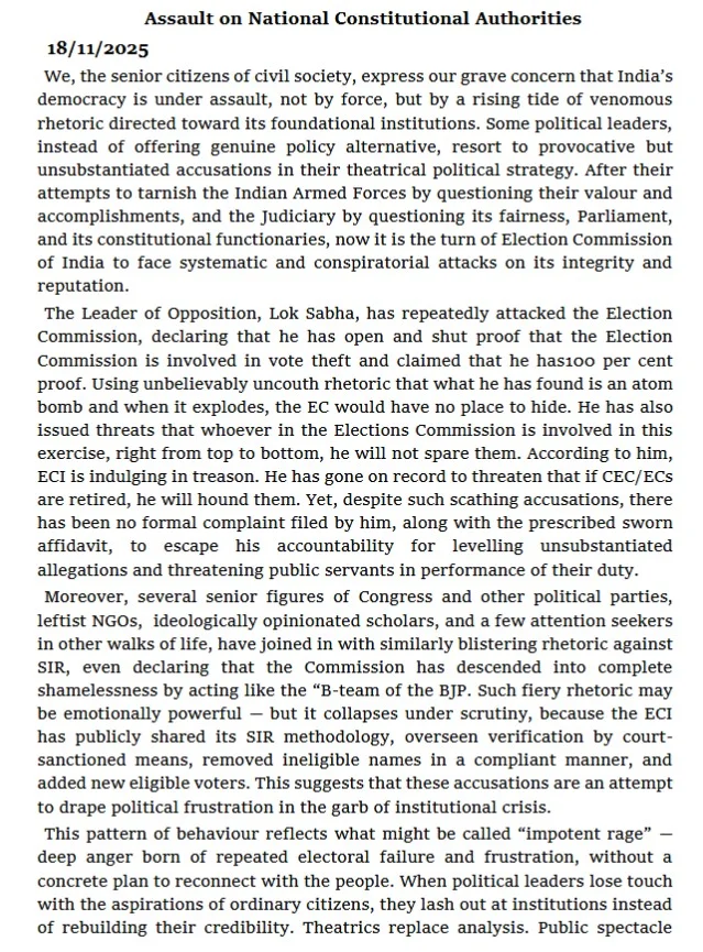 ਦੇਸ਼, 19 ਨਵੰਬਰ 2025: ਬੁੱਧਵਾਰ ਨੂੰ ਦੇਸ਼ ਭਰ ਦੇ 272 ਸੇਵਾਮੁਕਤ ਜੱਜਾਂ ਅਤੇ ਬਿਊਰੋਕ੍ਰੇਟਸ ਨੇ ਚੋਣ ਕਮਿਸ਼ਨ ‘ਤੇ ਕਥਿਤ ਵੋਟ-ਚੋਰੀ ਦੀ ਆਲੋਚਨਾ ਕਰਦੇ ਹੋਏ ਇੱਕ ਪੱਤਰ ਜਾਰੀ ਕੀਤਾ ਹੈ। ਇਸ ਪੱਤਰ ‘ਚ ਲੋਕ ਸਭਾ ‘ਚ ਵਿਰੋਧੀ ਧਿਰ ਦੇ ਆਗੂ ਰਾਹੁਲ ਗਾਂਧੀ ਅਤੇ ਕਾਂਗਰਸ ਪਾਰਟੀ ਦੀ ਆਲੋਚਨਾ ਕੀਤੀ ਹੈ। ਇਸ ਪੱਤਰ ‘ਤੇ 16 ਸਾਬਕਾ ਜੱਜਾਂ, 123 ਸੇਵਾਮੁਕਤ ਨੌਕਰਸ਼ਾਹਾਂ (ਬਿਊਰੋਕ੍ਰੇਟਸ )(14 ਸਾਬਕਾ ਰਾਜਦੂਤਾਂ ਸਮੇਤ) ਅਤੇ 133 ਸੇਵਾਮੁਕਤ ਫੌਜੀ ਅਧਿਕਾਰੀਆਂ ਦੇ ਦਸਤਖਤ ਹਨ।
