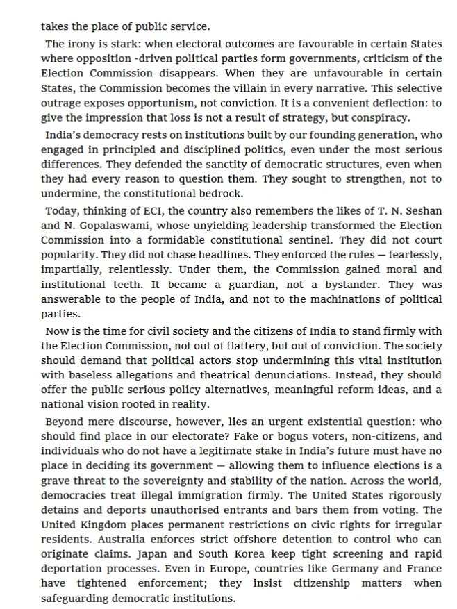 ਪੱਤਰ ‘ਚ ਇਹ ਵੀ ਕਿਹਾ ਗਿਆ ਹੈ ਕਿ ਚੋਣ ਕਮਿਸ਼ਨ ਭਾਰਤ ਦੀ ਚੋਣ ਪ੍ਰਣਾਲੀ ਦਾ ਸਭ ਤੋਂ ਮਹੱਤਵਪੂਰਨ ਥੰਮ੍ਹ ਹੈ। ਇਸ ‘ਤੇ ਵਾਰ-ਵਾਰ ਸਵਾਲ ਉਠਾਉਣਾ ਜਨਤਾ ਦੇ ਵਿਸ਼ਵਾਸ ਨੂੰ ਕਮਜ਼ੋਰ ਕਰਦਾ ਹੈ ਅਤੇ ਲੋਕਤੰਤਰ ਨੂੰ ਨੁਕਸਾਨ ਪਹੁੰਚਾਉਂਦਾ ਹੈ। ਰਾਜਨੀਤਿਕ ਮਤਭੇਦ ਜ਼ਰੂਰੀ ਹਨ, ਪਰ ਸੰਵਿਧਾਨਕ ਸੰਸਥਾਵਾਂ ‘ਤੇ ਲਗਾਤਾਰ ਦੋਸ਼ ਲਗਾਉਣਾ ਰਾਸ਼ਟਰੀ ਹਿੱਤ ਦੇ ਵਿਰੁੱਧ ਹੈ।