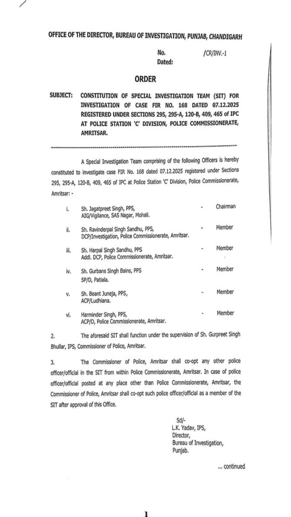 22 ਦਸੰਬਰ 2025: ਪੰਜਾਬ ਸਰਕਾਰ (punjab sarkar) ਨੇ ਸ੍ਰੀ ਗੁਰੂ ਗ੍ਰੰਥ ਸਾਹਿਬ ਦੇ 328 ਪਾਵਨ ਸਰੂਪਾਂ ਦੇ ਮਾਮਲੇ ‘ਚ ਅਹਿਮ ਕਦਮ ਚੁੱਕਿਆ ਹੈ, ਦੱਸ ਦੇਈਏ ਕਿ ਸਰਕਾਰ ਦੇ ਵਲੋਂ ਇਸ ਮਾਮਲੇ ਦੀ ਜਾਂਚ ਲਈ 6 ਮੈਂਬਰੀ SIT ਦਾ ਗਠਨ ਕੀਤਾ ਗਿਆ ਹੈ, ਜਿਸ ਦੀ ਅਗਵਾਈ AIG ਵਿਜੀਲੈਂਸ ਮੁਹਾਲੀ ਜਗਤਪ੍ਰੀਤ ਸਿੰਘ ਕਰਨਗੇ ਅਤੇ ਅੰਮ੍ਰਿਤਸਰ ਪੁਲਿਸ ਕਮਿਸ਼ਨਰ ਗੁਰਪ੍ਰੀਤ ਸਿੰਘ ਭੁੱਲਰ ਨਿਗਰਾਨੀ ਕਰਨਗੇ|