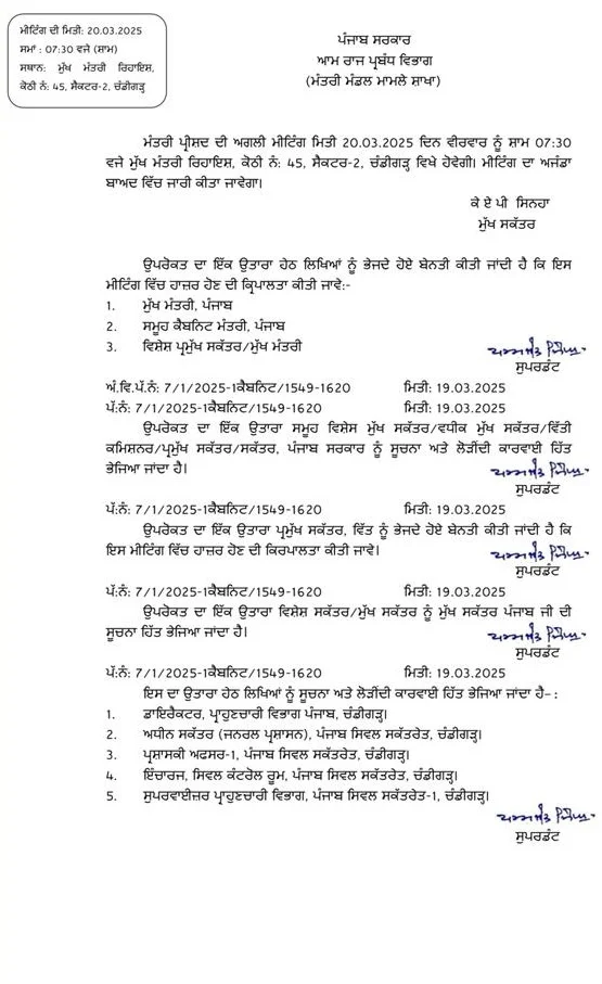 ਚੰਡੀਗੜ੍ਹ, 20 ਮਾਰਚ 2025: Punjab Cabinet Meeting: ਮੁੱਖ ਮੰਤਰੀ ਭਗਵੰਤ ਸਿੰਘ ਮਾਨ ਦੀ ਅਗਵਾਈ ਵਾਲੀ ਪੰਜਾਬ ਸਰਕਾਰ ਨੇ ਅੱਜ ਮੰਤਰੀ ਮੰਡਲ ਦੀ ਬੈਠਕ ਸੱਦ ਲਈ ਹੈ | ਇਹ ਬੈਠਕ ਅੱਜ ਸ਼ਾਮ 7:30 ਵਜੇ ਮੁੱਖ ਮੰਤਰੀ ਦੀ ਰਿਹਾਇਸ਼ ‘ਤੇ ਚੰਡੀਗੜ੍ਹ, ਸੈਕਟਰ-2 ਵਿਖੇ ਹੋਵੇਗੀ | ਸਰਕਾਰ ਦੇ ਪੱਤਰ ਮੁਤਾਬਕ ਇਸ ਪੰਜਾਬ ਕੈਬਿਨਟ ਬੈਠਕ ਦਾ ਏਜੰਡਾ ਫਿਲਹਾਲ ਬਾਅਦ ‘ਚ ਜਾਰੀ ਕੀਤਾ ਜਾਵੇਗਾ |