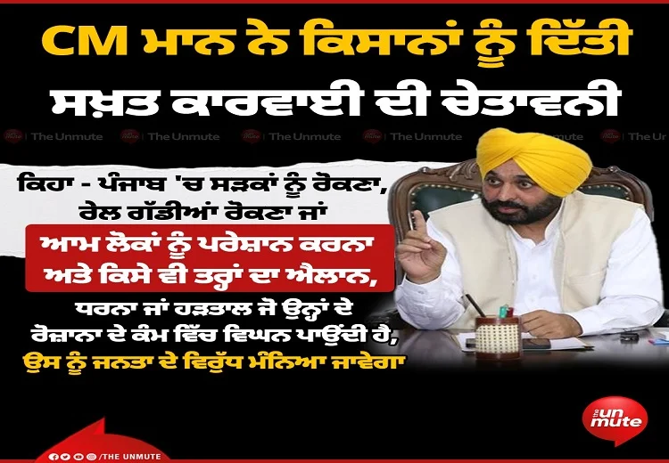 ਕਿਸਾਨਾਂ ਨੂੰ CM ਮਾਨ ਨੇ ਦਿੱਤੀ ਚੇਤਾਵਨੀ, ਪੰਜਾਬ ‘ਚ ਸੜਕਾਂ ਰੋਕਣਾ, ਰੇਲ ਗੱਡੀਆਂ ਰੋਕਣਾ ਜਾਂ ਆਮ ਲੋਕਾਂ ਨੂੰ ਪਰੇਸ਼ਾਨ ਕਰਨਾ