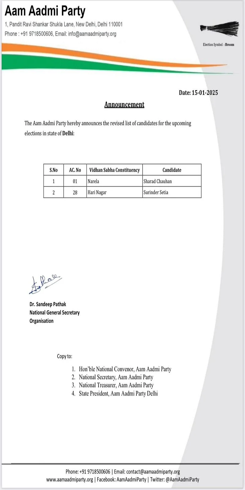 ਚੰਡੀਗੜ੍ਹ, 15 ਜਨਵਰੀ 2025: Delhi Assembly elections 2025: ਦਿੱਲੀ ‘ਚ ਅਗਾਮੀ ਵਿਧਾਨ ਸਭਾ ਚੋਣਾਂ 2025 ਦੇ ਮੱਦੇਨਜਰ ਆਮ ਆਦਮੀ ਪਾਰਟੀ (Aam Aadmi Party) ਦੀਆਂ ਤਿਆਰੀਆਂ ਜ਼ੋਰ-ਸ਼ੋਰਾਂ ‘ਤੇ ਹਨ | ਇਸ ਦੌਰਾਨ ਆਮ ਆਦਮੀ ਪਾਰਟੀ (ਆਪ) ਨੇ ਦਿੱਲੀ ਵਿਧਾਨ ਸਭਾ ਚੋਣਾਂ ਲਈ ਉਮੀਦਵਾਰਾਂ ਦੀ ਸੋਧੀ ਹੋਈ ਸੂਚੀ ਜਾਰੀ ਕਰ ਦਿੱਤੀ ਹੈ। ਜਿਸ ‘ਚ ‘ਆਪ’ ਨੇ ਨਰੇਲਾ ਵਿਧਾਨ ਸਭਾ ਸੀਟ ਤੋਂ ਸ਼ਰਦ ਚੌਹਾਨ ਅਤੇ ਹਰੀ ਨਗਰ ਤੋਂ ਸੁਰਿੰਦਰ ਸੇਤੀਆ ਨੂੰ ਟਿਕਟ ਦਿੱਤੀ ਹੈ
