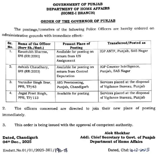 4 ਦਸੰਬਰ 2025: ਪੰਜਾਬ ਪੁਲਿਸ ਵਿਭਾਗ ਤੋਂ ਦੋ ਆਈਪੀਐਸ ਅਧਿਕਾਰੀਆਂ (IPS officer) ਸਮੇਤ ਚਾਰ ਅਧਿਕਾਰੀਆਂ ਦਾ ਤਬਾਦਲਾ ਕੀਤਾ ਗਿਆ ਹੈ। ਇਨ੍ਹਾਂ ਵਿੱਚੋਂ, ਸੰਯੁਕਤ ਰਾਸ਼ਟਰ ਦੇ ਕਾਰਜਕਾਲ ਤੋਂ ਵਾਪਸ ਆਏ ਆਈਪੀਐਸ ਕੌਸਤੁਭ ਸ਼ਰਮਾ ਨੂੰ ਏਐਨਟੀਐਫ ਦਾ ਆਈਜੀ ਨਿਯੁਕਤ ਕੀਤਾ ਗਿਆ ਹੈ। ਕੇਂਦਰੀ ਡੈਪੂਟੇਸ਼ਨ ਤੋਂ ਵਾਪਸ ਆਏ ਆਈਪੀਐਸ ਅਸ਼ੀਸ਼ ਚੌਧਰੀ ਨੂੰ ਕਾਊਂਟਰ ਇੰਟੈਲੀਜੈਂਸ ਦਾ ਆਈਜੀ ਨਿਯੁਕਤ ਕੀਤਾ ਗਿਆ ਹੈ। ਇਸ ਤੋਂ ਇਲਾਵਾ, ਪੀਪੀਐਸ ਅਧਿਕਾਰੀਆਂ ਏਆਈਜੀ ਵਰਿੰਦਰ ਸਿੰਘ ਬਰਾੜ ਅਤੇ ਜਗਤਪ੍ਰੀਤ ਸਿੰਘ ਨੂੰ ਵਿਜੀਲੈਂਸ ਬਿਊਰੋ ਵਿੱਚ ਤਾਇਨਾਤ ਕੀਤਾ ਗਿਆ ਹੈ।