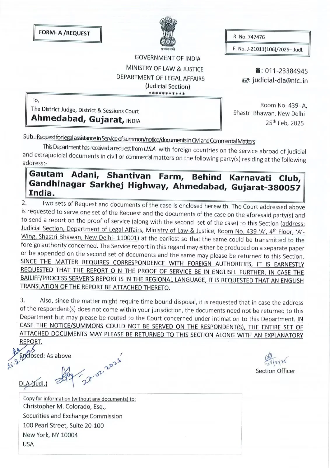ਕਾਨੂੰਨ ਮੰਤਰਾਲੇ ਨੇ 25 ਫਰਵਰੀ ਨੂੰ ਅਹਿਮਦਾਬਾਦ ਅਦਾਲਤ ਨੂੰ ਇੱਕ ਪੱਤਰ ਲਿਖਿਆ ਅਤੇ ਸਪੱਸ਼ਟ ਤੌਰ ‘ਤੇ ਕਿਹਾ ਕਿ ਇਹ ਇੱਕ ਵਿਦੇਸ਼ੀ ਅਦਾਲਤ ਦਾ ਮਾਮਲਾ ਹੈ, ਇਸ ਲਈ ਇਸਨੂੰ ਛੇਤੀ ਨਿਪਟਾਉਣਾ ਜ਼ਰੂਰੀ ਹੈ। ਕੇਂਦਰੀ ਮੰਤਰਾਲੇ ਨੇ ਅਦਾਲਤ ਨੂੰ ਗੌਤਮ ਅਡਾਨੀ (Gautam Adani) ਨੂੰ ਸੰਮਨ ਅਤੇ ਨੋਟਿਸ ਜਾਰੀ ਕਰਨ ਲਈ ਕਿਹਾ ਹੈ। ਚਰਚਾ ਇਹ ਵੀ ਹੈ ਕਿ ਅਦਾਲਤ ਨੇ ਨੋਟਿਸ ਭੇਜਣ ਦੀ ਤਿਆਰੀ ਸ਼ੁਰੂ ਕਰ ਦਿੱਤੀ ਹੈ| ਫਿਲਹਾਲ ਇਹ ਮਾਮਲਾ ਅਦਾਲਤ ‘ਚ ਵਿਚਾਰ ਅਧੀਨ ਹੈ ਅਤੇ ਮੰਤਰਾਲੇ ਨਾਲ ਸਬੰਧਤ ਹੈ।