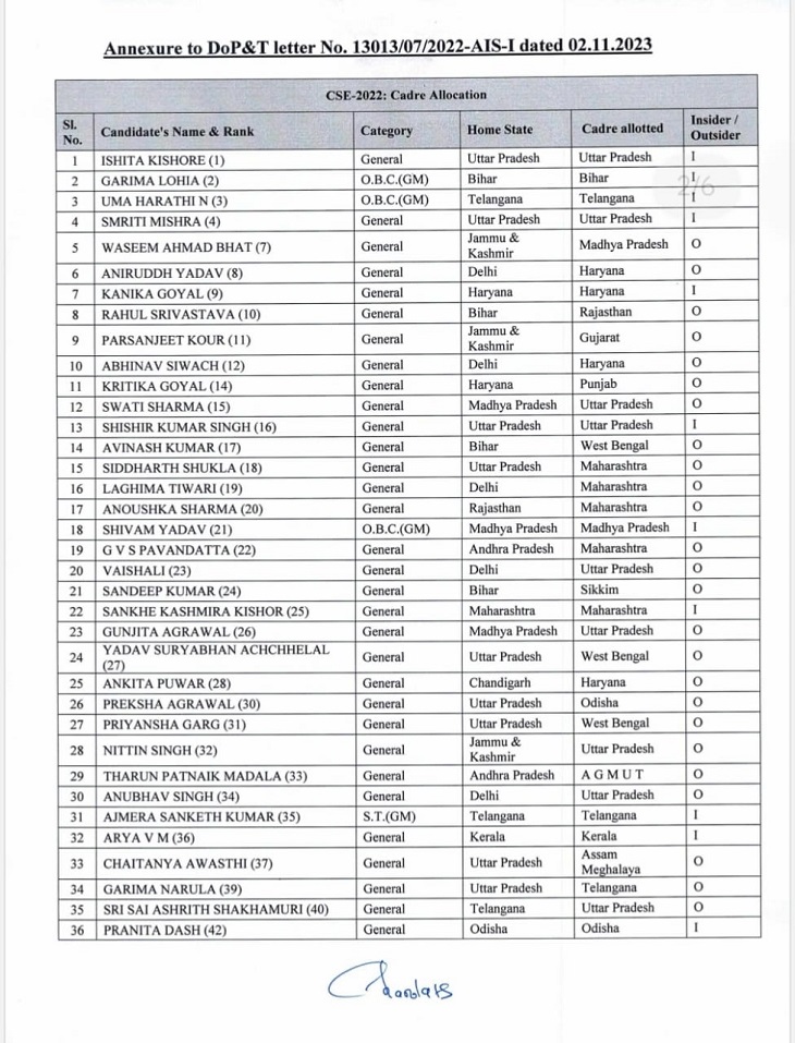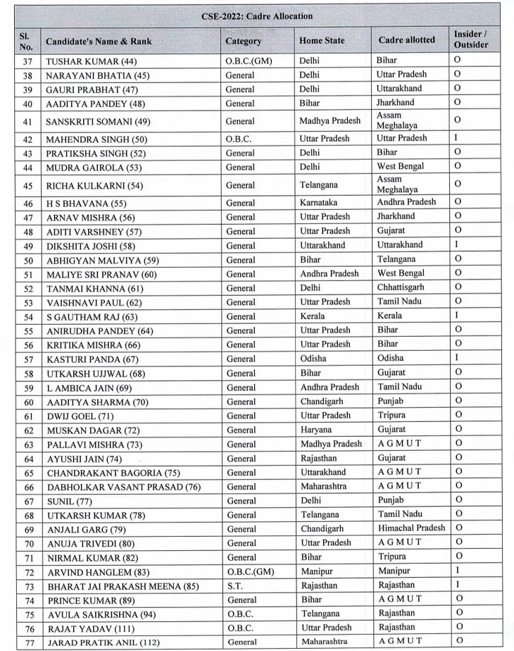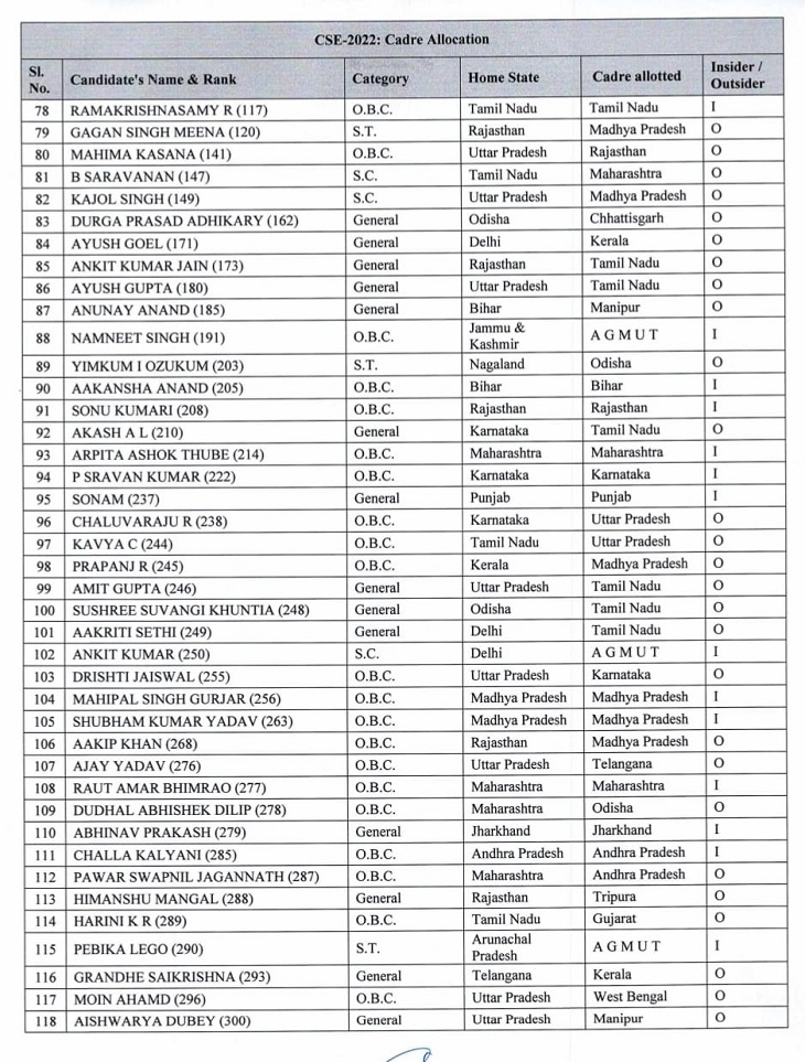 179 ਆਈਏਐਸ ਅਧਿਕਾਰੀਆਂ (IAS officers) ਨੂੰ ਕੇਡਰ ਅਲਾਟ ਕਰਨ ਦੀ ਸੂਚੀ ਅਨੁਸਾਰ ਆਲ ਇੰਡੀਆ ਪੱਧਰ ’ਤੇ 14ਵਾਂ ਰੈਂਕ ਹਾਸਲ ਕਰਨ ਵਾਲੀ ਹਰਿਆਣਾ ਦੀ ਕ੍ਰਿਤਿਕਾ ਗੋਇਲ ਨੂੰ ਵੀ ਪੰਜਾਬ ਕੇਡਰ ਮਿਲਿਆ ਹੈ। ਇਨ੍ਹਾਂ ਤੋਂ ਇਲਾਵਾ 70ਵਾਂ ਰੈਂਕ ਪ੍ਰਾਪਤ ਕਰਨ ਵਾਲੇ ਆਦਿਤਿਆ ਸ਼ਰਮਾ, 77ਵਾਂ ਰੈਂਕ ਪ੍ਰਾਪਤ ਕਰਨ ਵਾਲੇ ਸੁਨੀਲ, 237ਵਾਂ ਰੈਂਕ ਪ੍ਰਾਪਤ ਕਰਨ ਵਾਲੇ ਸੋਨਮ ਅਤੇ 507ਵਾਂ ਰੈਂਕ ਪ੍ਰਾਪਤ ਕਰਨ ਵਾਲੇ ਰਾਕੇਸ਼ ਕੁਮਾਰ ਮੀਨਾ ਨੂੰ ਪੰਜਾਬ ਕੇਡਰ ਵਿੱਚ ਭੇਜਿਆ ਗਿਆ ਹੈ | ਇਨ੍ਹਾਂ ਵਿੱਚੋਂ ਆਦਿਤਿਆ ਸ਼ਰਮਾ ਚੰਡੀਗੜ੍ਹ, ਸੁਨੀਲ ਦਿੱਲੀ ਅਤੇ ਰਾਕੇਸ਼ ਕੁਮਾਰ ਮੀਨਾ ਰਾਜਸਥਾਨ ਤੋਂ ਹਨ।