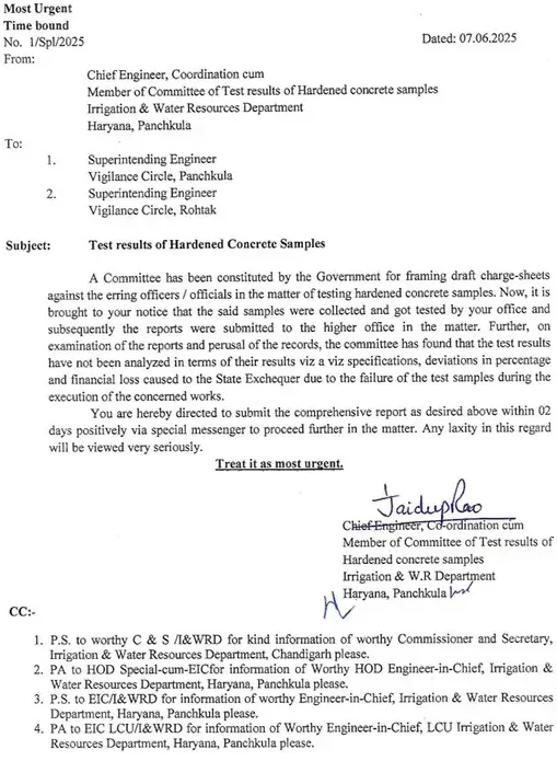 ਸਿੰਚਾਈ ਵਿਭਾਗ ਨੇ ਹਾਲ ਹੀ ਵਿੱਚ ਕਈ ਜ਼ਿਲ੍ਹਿਆਂ ਵਿੱਚ ਨਿਰਮਾਣ ਅਧੀਨ ਪ੍ਰੋਜੈਕਟਾਂ ਦੇ ਨਮੂਨੇ ਲਏ ਸਨ, ਜੋ ਅਸਫਲ ਪਾਏ ਗਏ ਸਨ। ਹਰਿਆਣਾ ਸਰਕਾਰ ਨੇ ਇਸ ਲਈ ਇੱਕ ਜਾਂਚ ਕਮੇਟੀ ਵੀ ਬਣਾਈ ਸੀ। ਇਸ ਸਮੇਂ, ਹੈੱਡਕੁਆਰਟਰ ਦੁਆਰਾ ਸਾਰੇ ਜ਼ਿਲ੍ਹਿਆਂ ਦੇ ਸਿੰਚਾਈ ਮੁਖੀਆਂ ਨੂੰ ਚਾਰਜਸ਼ੀਟ ਦੇ ਆਦੇਸ਼ ਭੇਜੇ ਜਾ ਰਹੇ ਹਨ। ਹਾਲਾਂਕਿ, ਵਿਭਾਗ ਨੇ ਅਜੇ ਤੱਕ ਨਾਵਾਂ ਦਾ ਖੁਲਾਸਾ ਨਹੀਂ ਕੀਤਾ ਹੈ।