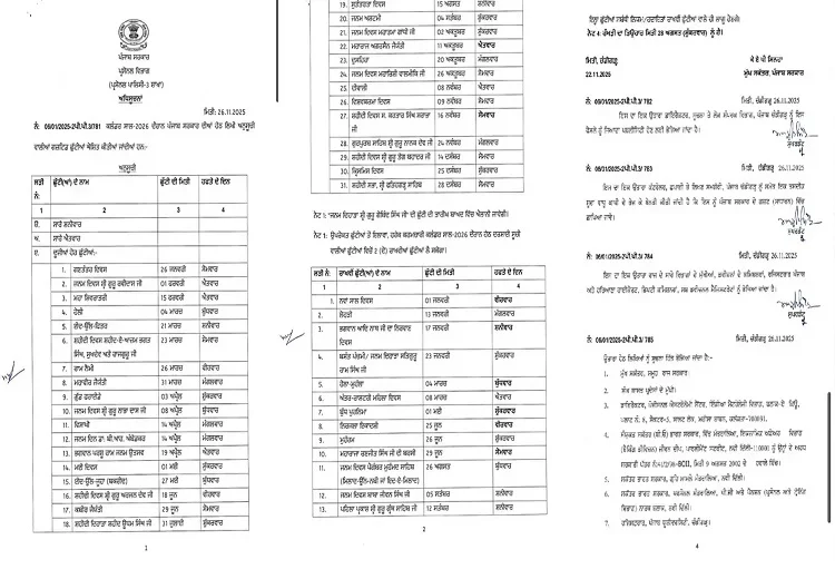 26 ਨਵੰਬਰ 2025: ਪੰਜਾਬ ਸਰਕਾਰ (punjab sarkar) ਨੇ ਸਾਲ 2026 ਲਈ ਛੁੱਟੀਆਂ ਦਾ ਕੈਲੰਡਰ ਤਿਆਰ ਕੀਤਾ ਹੈ। ਇਹ ਪੰਜਾਬ ਸਰਕਾਰ ਦੇ ਪ੍ਰਸੋਨਲ ਵਿਭਾਗ ਦੁਆਰਾ ਤਿਆਰ ਕੀਤਾ ਗਿਆ। ਦੱਸਿਆ ਜਾ ਰਿਹਾ ਹੈ ਕਿ ਕੈਲੰਡਰ ਵਿੱਚ ਸੂਚੀਬੱਧ ਛੁੱਟੀਆਂ ਦੌਰਾਨ ਸਰਕਾਰੀ ਦਫ਼ਤਰ, ਨਗਰ ਨਿਗਮ, ਸਕੂਲ, ਕਾਲਜ, ਪ੍ਰਸ਼ਾਸਨਿਕ ਦਫ਼ਤਰ ਅਤੇ ਹੋਰ ਸਰਕਾਰੀ ਸ਼ਾਖਾਵਾਂ ਬੰਦ ਰਹਿਣਗੀਆਂ।