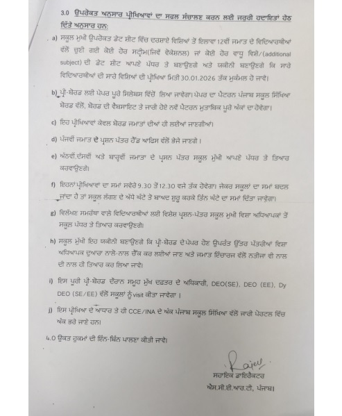 ਨੋਟੀਫਿਕੇਸ਼ਨ ਅਨੁਸਾਰ, ਸਾਰੇ ਸਰਕਾਰੀ ਸਕੂਲਾਂ ਵਿੱਚ ਵਿਦਿਆਰਥੀਆਂ ਲਈ ਪ੍ਰੀ-ਬੋਰਡ (pre-board exam) ਪ੍ਰੀਖਿਆਵਾਂ ਸੁਚਾਰੂ ਢੰਗ ਨਾਲ ਕਰਵਾਈਆਂ ਜਾਣਗੀਆਂ। ਸਿੱਖਿਆ ਵਿਭਾਗ ਨੇ ਸਾਰੇ ਸਕੂਲ ਪ੍ਰਿੰਸੀਪਲਾਂ ਅਤੇ ਜ਼ਿਲ੍ਹਾ ਸਿੱਖਿਆ ਅਧਿਕਾਰੀਆਂ ਨੂੰ ਅਪੀਲ ਕੀਤੀ ਹੈ ਕਿ ਉਹ ਵਿਦਿਆਰਥੀਆਂ ਨੂੰ ਸਮੇਂ ਸਿਰ ਸੂਚਿਤ ਕਰਨ ਅਤੇ ਪ੍ਰੀਖਿਆਵਾਂ ਲਈ ਜ਼ਰੂਰੀ ਤਿਆਰੀਆਂ ਨੂੰ ਯਕੀਨੀ ਬਣਾਉਣ।