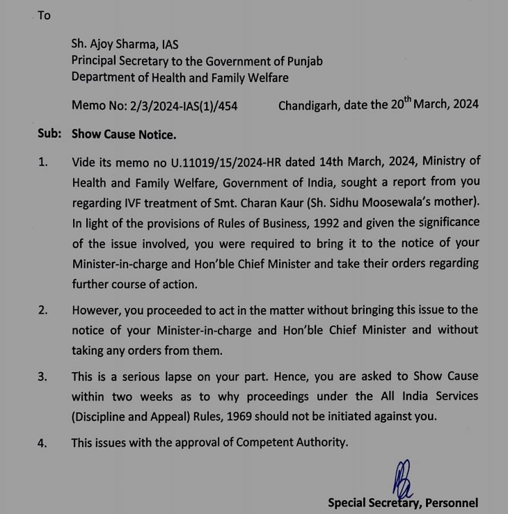 ਸਿੱਧੂ ਮੂਸੇਵਾਲਾ ਦੇ ਪਰਿਵਾਰ ‘ਤੇ ਲਾਗੂ ਨਹੀਂ ਹੋਵੇਗਾ ਭਾਰਤੀ ਕਾਨੂੰਨ, ਪੰਜਾਬ ਸਰਕਾਰ ਵੱਲੋਂ ਸਿਹਤ ਸਕੱਤਰ ਨੂੰ ਨੋਟਿਸ ਜਾਰੀ