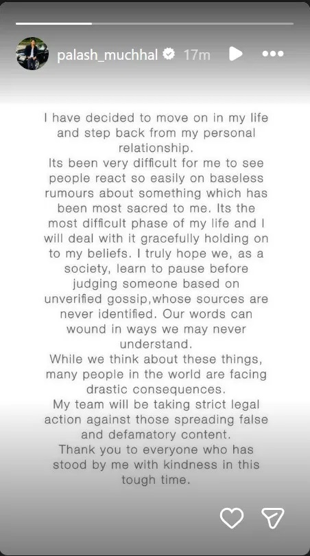 ਇਸ ਤੋਂ ਬਾਅਦ, ਪਲਾਸ਼ ਨੇ ਲਿਖਿਆ, “ਮੈਂ ਆਪਣੀ ਜ਼ਿੰਦਗੀ ਦੇ ਨਾਲ ਅੱਗੇ ਵਧਣ ਦਾ ਫੈਸਲਾ ਕੀਤਾ ਹੈ ਅਤੇ ਆਪਣੇ ਨਿੱਜੀ ਰਿਸ਼ਤਿਆਂ ਤੋਂ ਦੂਰ ਰਹਿਣ ਦਾ ਫੈਸਲਾ ਕੀਤਾ ਹੈ। ਮੇਰੇ ਲਈ ਇਹ ਦੇਖਣਾ ਬਹੁਤ ਮੁਸ਼ਕਲ ਰਿਹਾ ਹੈ ਕਿ ਲੋਕ ਮੇਰੇ ਲਈ ਸਭ ਤੋਂ ਪਵਿੱਤਰ ਚੀਜ਼ ਬਾਰੇ ਬੇਬੁਨਿਆਦ ਅਫਵਾਹਾਂ ‘ਤੇ ਇੰਨੀ ਆਸਾਨੀ ਨਾਲ ਪ੍ਰਤੀਕਿਰਿਆ ਕਰਦੇ ਹਨ। ਇਹ ਮੇਰੀ ਜ਼ਿੰਦਗੀ ਦਾ ਸਭ ਤੋਂ ਮੁਸ਼ਕਲ ਸਮਾਂ ਹੈ, ਅਤੇ ਮੈਂ ਆਪਣੇ ਵਿਸ਼ਵਾਸਾਂ ਵਿੱਚ ਦ੍ਰਿੜ ਰਹਿ ਕੇ ਇਸ ਨਾਲ ਨਜਿੱਠਾਂਗਾ। ਮੈਨੂੰ ਸੱਚਮੁੱਚ ਉਮੀਦ ਹੈ ਕਿ ਅਸੀਂ, ਇੱਕ ਸਮਾਜ ਦੇ ਤੌਰ ‘ਤੇ, ਕਿਸੇ ਅਜਿਹੇ ਵਿਅਕਤੀ ਬਾਰੇ ਰਾਏ ਬਣਾਉਣ ਤੋਂ ਪਹਿਲਾਂ ਰੁਕਣਾ ਸਿੱਖਾਂਗੇ ਜਿਸਦੇ ਸਰੋਤਾਂ ਦੀ ਕਦੇ ਪਛਾਣ ਨਹੀਂ ਹੁੰਦੀ। ਸਾਡੇ ਸ਼ਬਦ ਜ਼ਖ਼ਮ ਦੇ ਸਕਦੇ ਹਨ ਜਿਨ੍ਹਾਂ ਨੂੰ ਅਸੀਂ ਕਦੇ ਨਹੀਂ ਸਮਝ ਸਕਾਂਗੇ।”