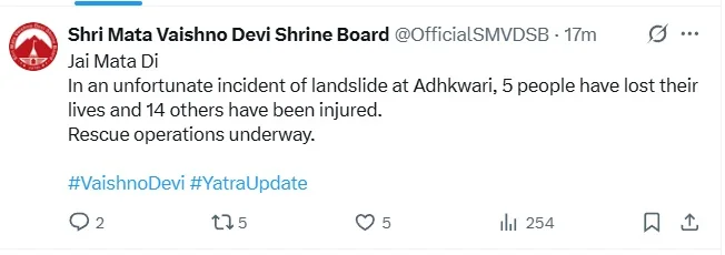 ਅਧਿਕਾਰੀਆਂ ਨੇ ਕਿਹਾ ਕਿ ਜ਼ਮੀਨ ਖਿਸਕਣ ਕਾਰਨ ਮਾਤਾ ਵੈਸ਼ਨੋ ਦੇਵੀ ਦੀ ਯਾਤਰਾ ਨੂੰ ਅਸਥਾਈ ਤੌਰ ‘ਤੇ ਮੁਅੱਤਲ ਕਰ ਦਿੱਤਾ ਗਿਆ ਸੀ। ਅਧਿਕਾਰੀਆਂ ਨੇ ਕਿਹਾ ਕਿ ਅਰਧਕੁਮਾਰੀ ਨੇੜੇ ਜ਼ਮੀਨ ਖਿਸਕਣ ਤੋਂ ਬਾਅਦ ਬਚਾਅ ਕਾਰਜ ਚੱਲ ਰਹੇ ਹਨ, ਜ਼ਮੀਨ ਖਿਸਕਣ ਦੁਪਹਿਰ 3 ਵਜੇ ਦੇ ਕਰੀਬ ਹੋਇਆ। ਇਹ ਆਫ਼ਤ ਪਹਾੜੀ ‘ਤੇ ਸਥਿਤ ਮੰਦਰ ਵੱਲ ਜਾਣ ਵਾਲੇ 12 ਕਿਲੋਮੀਟਰ ਦੇ ਘੁੰਮਦੇ ਰਸਤੇ ‘ਤੇ ਲਗਭਗ ਅੱਧੇ ਰਸਤੇ ‘ਤੇ ਆਈ।
