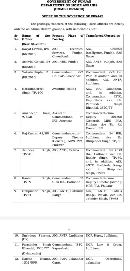 6 ਅਪ੍ਰੈਲ 2205: ਪੰਜਾਬ ਪੁਲਿਸ (punjab police) ਵਿੱਚ ਵੱਡਾ ਫੇਰਬਦਲ ਕੀਤਾ ਗਿਆ ਹੈ। ਤਿੰਨ ਆਈਪੀਐਸ ਅਧਿਕਾਰੀਆਂ ਸਮੇਤ 97 ਪੁਲਿਸ ਅਧਿਕਾਰੀਆਂ ਦੇ ਤਬਾਦਲੇ (transfers) ਕੀਤੇ ਗਏ ਹਨ। ਇਸ ਫੇਰਬਦਲ ਵਿੱਚ, ਰਵਜੋਤ ਗਰੇਵਾਲ ਨੂੰ ਏਆਈਜੀ (ਕਾਊਂਟਰ ਇੰਟੈਲੀਜੈਂਸ) ਅਤੇ ਅਸ਼ਵਨੀ ਗੋਇਲ (ashvani goyal) ਨੂੰ ਏਆਈਜੀ (ਏਐਨਟੀਐਫ) ਨਿਯੁਕਤ ਕੀਤਾ ਗਿਆ ਹੈ।
