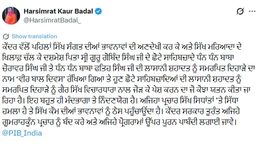 MP ਹਰਸਿਮਰਤ ਕੌਰ ਬਾਦਲ ਨੇ ਕੇਂਦਰ ਸਰਕਾਰ ਵੱਲੋਂ ਜਾਰੀ ਕੀਤੇ ਵੀਰ ਬਾਲ ਦਿਵਸ ਦੇ ਪੋਸਟਰ ਦਾ ਸਖ਼ਤ ਵਿਰੋਧ ਕੀਤਾ