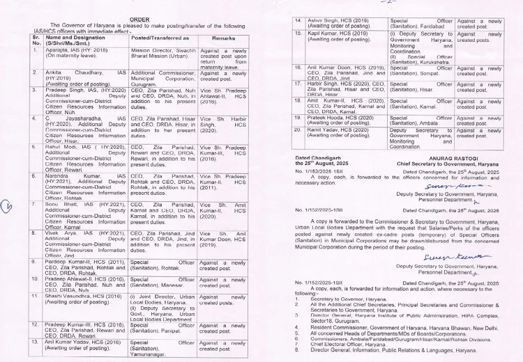 25 ਅਗਸਤ 2025: ਹਰਿਆਣਾ (haryana) ਵਿੱਚ ਇੱਕ ਵਾਰ ਫਿਰ ਤੋਂ ਵੱਡਾ ਪ੍ਰਸ਼ਾਸਕੀ ਫੇਰਬਦਲ ਹੋਇਆ ਹੈ। ਦੱਸ ਦੇਈਏ ਕਿ ਰਾਜ ਸਰਕਾਰ ਨੇ 20 ਆਈਏਐਸ/ਐਚਸੀਐਸ ਅਧਿਕਾਰੀਆਂ ਦੇ ਤਬਾਦਲੇ ਕੀਤੇ ਹਨ। ਇਨ੍ਹਾਂ ਵਿੱਚ ਆਈਏਐਸ ਅਪਰਾਜਿਤਾ, ਸਵੱਛ ਭਾਰਤ ਮਿਸ਼ਨ ਦੀ ਡਾਇਰੈਕਟਰ ਅਤੇ ਗੁਰੂਗ੍ਰਾਮ ਨਗਰ ਨਿਗਮ ਦੀ ਵਧੀਕ ਕਮਿਸ਼ਨਰ ਸਮੇਤ ਕਈ ਅਧਿਕਾਰੀ ਸ਼ਾਮਲ ਹਨ। ਦੇਖੋ ਲਿਸਟ ..
