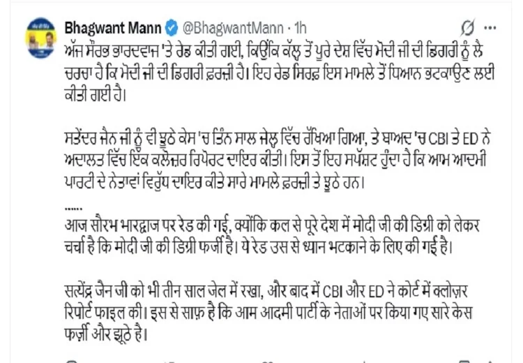 ਮੁੱਖ ਮੰਤਰੀ ਭਗਵੰਤ ਸਿੰਘ ਮਾਨ (bhagwant singh maan) ਨੇ ਟਵੀਟ ਕੀਤਾ, “ਅੱਜ ਸੌਰਭ ਭਾਰਦਵਾਜ ਦੇ ਘਰ ਛਾਪਾ ਮਾਰਿਆ ਗਿਆ, ਕਿਉਂਕਿ ਕੱਲ੍ਹ ਤੋਂ ਪੂਰੇ ਦੇਸ਼ ਵਿੱਚ ਚਰਚਾ ਚੱਲ ਰਹੀ ਹੈ ਕਿ ਮੋਦੀ ਜੀ ਦੀ ਡਿਗਰੀ ਜਾਅਲੀ ਹੈ। ਇਹ ਛਾਪਾ ਸਿਰਫ ਇਸ ਮਾਮਲੇ ਤੋਂ ਧਿਆਨ ਹਟਾਉਣ ਲਈ ਕੀਤਾ ਗਿਆ ਹੈ।”