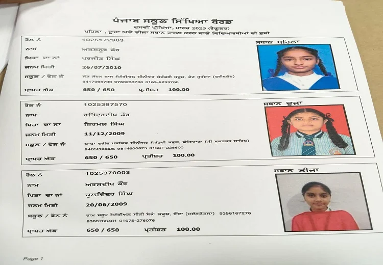 16 ਮਈ 2025: ਪੰਜਾਬ ਸਕੂਲ ਸਿੱਖਿਆ (Punjab School Education Board) ਬੋਰਡ (PSEB) ਨੇ ਸ਼ੁੱਕਰਵਾਰ (16 ਮਈ) ਨੂੰ 10ਵੀਂ ਜਮਾਤ ਦਾ ਨਤੀਜਾ ਐਲਾਨ ਦਿੱਤਾ। ਜਿਸ ਵਿੱਚ 95 ਪ੍ਰਤੀਸ਼ਤ ਵਿਦਿਆਰਥੀ ਪਾਸ ਹੋਏ ਹਨ। ਕੁੱਲ 2,77,746 ਵਿਦਿਆਰਥੀਆਂ ਵਿੱਚੋਂ 2,65,548 ਪਾਸ ਹੋਏ। ਸੂਬੇ ਵਿੱਚੋਂ ਟਾਪ (top) ਕਰਨ ਵਾਲੀਆਂ ਤਿੰਨੋਂ ਕੁੜੀਆਂ ਹਨ।