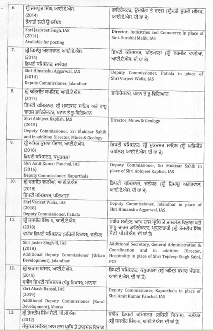 ਹਿਮਾਂਸ਼ੂ ਅਗਰਵਾਲ ਨੂੰ ਪਟਿਆਲਾ ਦਾ ਨਵਾਂ ਡਿਪਟੀ ਕਮਿਸ਼ਨਰ ਨਿਯੁਕਤ ਕੀਤਾ ਗਿਆ ਹੈ, ਜਦੋਂ ਕਿ ਅਮਿਤ ਕੁਮਾਰ ਪੰਚਾਲ ਨੂੰ ਸ੍ਰੀ ਮੁਕਤਸਰ ਸਾਹਿਬ ਦਾ ਨਵਾਂ ਡਿਪਟੀ ਕਮਿਸ਼ਨਰ ਨਿਯੁਕਤ ਕੀਤਾ ਗਿਆ ਹੈ। ਵਰਜੀਤ ਵਾਲੀਆ ਹੁਣ ਜਲੰਧਰ ਦਾ ਨਵਾਂ ਡਿਪਟੀ ਕਮਿਸ਼ਨਰ ਹੋਵੇਗਾ। ਆਕਾਸ਼ ਬਾਂਸਲ ਨੂੰ ਕਪੂਰਥਲਾ ਦਾ ਨਵਾਂ ਡਿਪਟੀ ਕਮਿਸ਼ਨਰ ਨਿਯੁਕਤ ਕੀਤਾ ਗਿਆ ਹੈ।