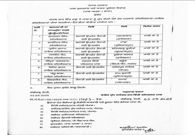 4 ਸਤੰਬਰ 2025: ਪੰਜਾਬ ਸਰਕਾਰ (Punjab government) ਨੇ ਸੂਬੇ ਦੇ 8 ਨਾਇਬ ਤਹਿਸੀਲਦਾਰਾਂ ਦੇ ਤਬਾਦਲੇ ਕੀਤੇ ਹਨ। ਪੰਜਾਬ ਸਰਕਾਰ ਦੇ ਮਾਲ, ਪੁਨਰਵਾਸ ਅਤੇ ਆਫ਼ਤ ਪ੍ਰਬੰਧਨ ਵਿਭਾਗ ਵੱਲੋਂ, ਸੂਬੇ ਵਿੱਚ ਹੜ੍ਹਾਂ ਦੀ ਸਥਿਤੀ ਦੇ ਮੱਦੇਨਜ਼ਰ, ਤਹਿਸੀਲਦਾਰਾਂ/ਨਾਇਬ ਤਹਿਸੀਲਦਾਰਾਂ ਦੇ ਤਬਾਦਲੇ/ਨਿਯੁਕਤੀਆਂ ਕੀਤੀਆਂ ਗਈਆਂ ਹਨ, ਜੋ ਕਿ ਹੇਠ ਲਿਖੇ ਅਨੁਸਾਰ ਹਨ:-