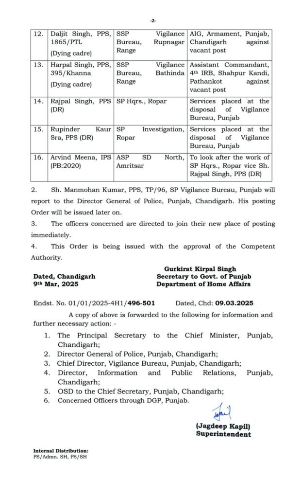 ਚੰਡੀਗੜ੍ਹ, 09 ਮਾਰਚ 2025: ਪੰਜਾਬ ਸਰਕਾਰ ਨੇ ਪੁਲਿਸ ਦੇ ਵਿਜੀਲੈਂਸ ਵਿਭਾਗ ‘ਚ ਵੱਡਾ ਫੇਰਬਦਲ ਕੀਤਾ ਹੈ। ਇਸ ਦੇ ਨਾਲ ਹੀ, ਫੇਰਬਦਲ ਸੂਚੀ ਜਾਰੀ ਕਰਦੇ ਹੋਏ 6 ਐਸਐਸਪੀਜ਼ ਦਾ ਤਬਾਦਲਾ ਕੀਤਾ ਗਿਆ ਹੈ। ਇੱਕ ਆਈਪੀਐਸ ਅਧਿਕਾਰੀ ਸਮੇਤ ਕੁੱਲ 16 ਪੁਲਿਸ ਅਧਿਕਾਰੀਆਂ ਦੇ ਤਬਾਦਲੇ ਕੀਤੇ ਗਏ ਹਨ। ਰੁਪਿੰਦਰ ਸਿੰਘ ਨੂੰ ਡੀਸੀਪੀ ਸਿਟੀ ਲੁਧਿਆਣਾ ਨਿਯੁਕਤ ਕੀਤਾ ਗਿਆ ਹੈ। ਜਿਨ੍ਹਾਂ ਦੀ ਸੂਚੀ ਹੇਠਾਂ ਦਿੱਤੀ ਗਈ ਹੈ।