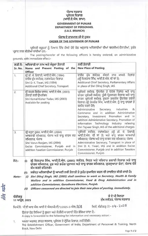ਪੰਜਾਬ ਸਰਕਾਰ ਵੱਲੋਂ ਜਾਰੀ ਹੁਕਮਾਂ ਅਨੁਸਾਰ ਸਬੰਧਤ ਅਧਿਕਾਰੀਆਂ ਨੂੰ ਤੁਰੰਤ ਪ੍ਰਭਾਵ ਨਾਲ ਆਪਣੀਆਂ ਨਵੀਆਂ ਜ਼ਿੰਮੇਵਾਰੀਆਂ ਸੰਭਾਲਣ ਦੇ ਨਿਰਦੇਸ਼ ਦਿੱਤੇ ਗਏ ਹਨ।