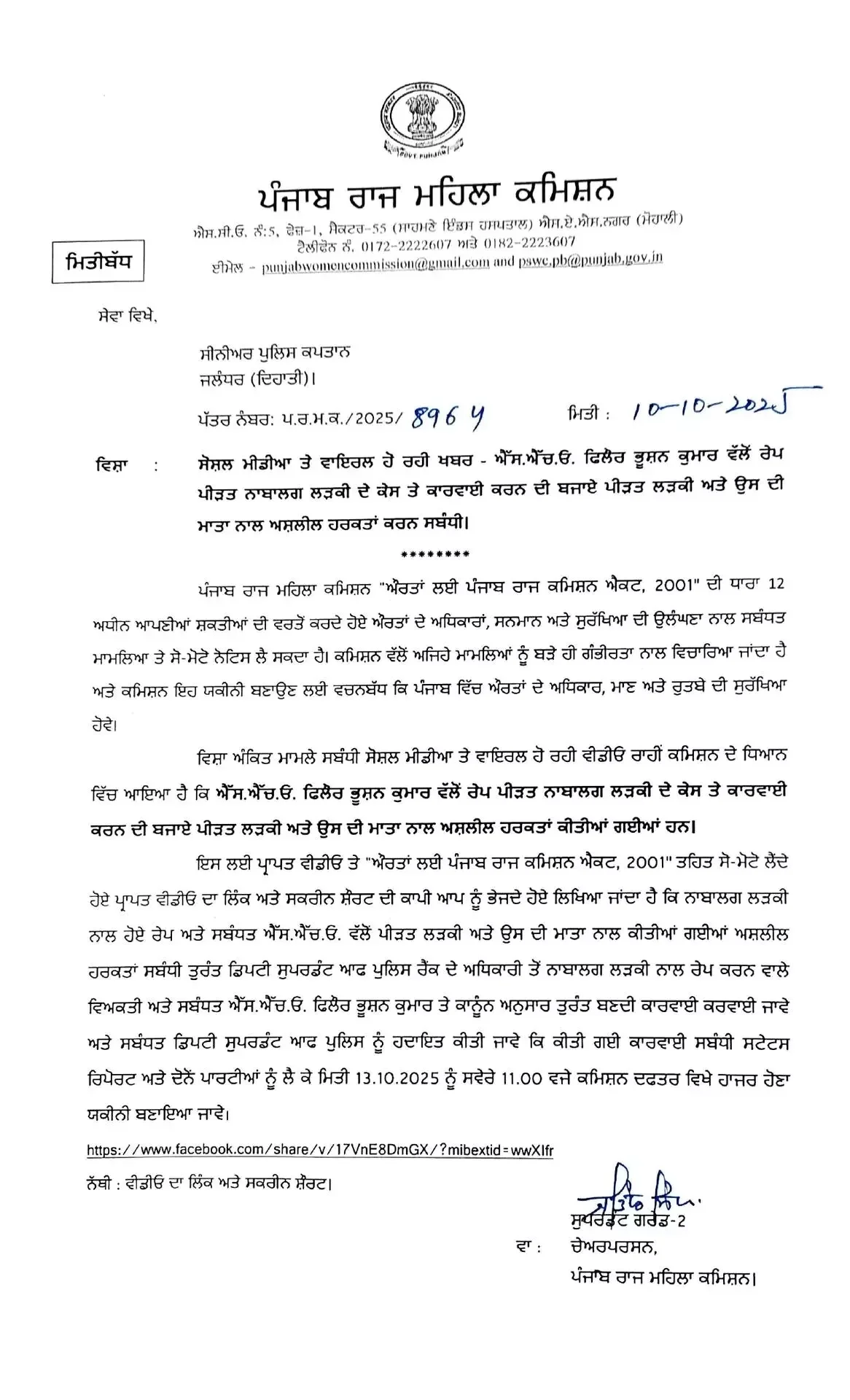 ਫਿਲੌਰ, 10 ਅਕਤੂਬਰ 2025: ਫਿਲੌਰ ਪੁਲਿਸ ਸਟੇਸ਼ਨ ਦੇ ਐਸਐਚਓ ਭੂਸ਼ਣ ਕੁਮਾਰ ਵੱਲੋਂ ਬਲਾਤਕਾਰ ਪੀੜਤਾ ਦੀ ਮਾਂ ਨੂੰ ਇਕੱਲਿਆਂ ਬੁਲਾਉਣ ਦੇ ਮਾਮਲੇ ‘ਚ ਪੰਜਾਬ ਮਹਿਲਾ ਕਮਿਸ਼ਨ ਨੇ ਐਸਐਸਪੀ ਨੂੰ ਨੋਟਿਸ ਜਾਰੀ ਕੀਤਾ ਹੈ। ਕਮਿਸ਼ਨ ਨੇ ਕਿਹਾ ਕਿ ਬਲਾਤਕਾਰ ਪੀੜਤਾ ਦੇ ਮਾਮਲੇ ‘ਚ ਕਾਰਵਾਈ ਕਰਨ ਦੀ ਬਜਾਏ, ਐਸਐਚਓ ਭੂਸ਼ਣ ਕੁਮਾਰ ਨੇ ਪੀੜਤਾ ਅਤੇ ਉਸਦੀ ਮਾਂ ਨਾਲ ਅਣਉਚਿਤ ਵਿਵਹਾਰ ਕੀਤਾ। ਇਸ ਦੀ ਇੱਕ ਵੀਡੀਓ ਸੋਸ਼ਲ ਮੀਡੀਆ ‘ਤੇ ਸਾਹਮਣੇ ਆਈ ਹੈ। ਇਸ ਵੀਡੀਓ ਤੋਂ ਬਾਅਦ, ਪੰਜਾਬ ਰਾਜ ਮਹਿਲਾ ਕਮਿਸ਼ਨ ਨੇ ਨੋਟਿਸ ਲਿਆ।