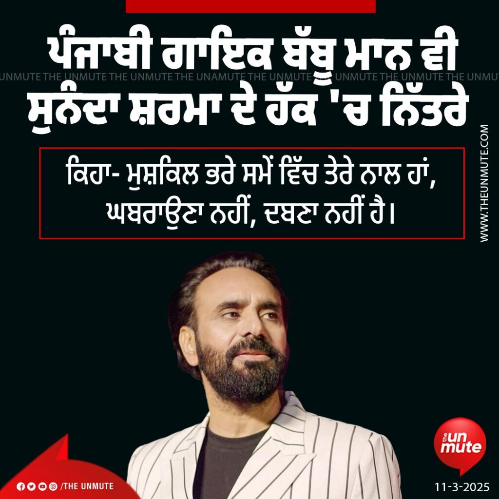 ਇਸ ਦੇ ਨਾਲ ਹੀ ਪੰਜਾਬੀ ਗਾਇਕ ਬੱਬੂ ਮਾਨ ਵੀ ਸੁਨੰਦਾ ਸ਼ਰਮਾ ਦੇ ਹੱਕ ਵਿਚ ਨਿੱਤਰੇ ਹਨ। ਉਨ੍ਹਾਂ ਕਿਹਾ ਕਿ ਮੁਸ਼ਕਿਲ ਭਰੇ ਸਮੇਂ ਵਿੱਚ ਤੇਰੇ ਨਾਲ ਹਾਂ। ਘਬਰਾਉਣਾ ਨਹੀਂ, ਦਬਣਾ ਨਹੀਂ ਹੈ।