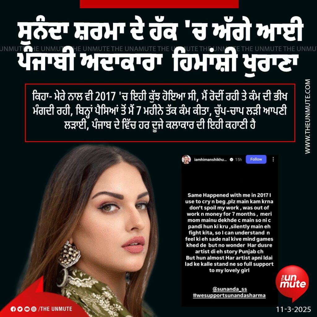 ਸੁਨੰਦਾ ਸ਼ਰਮਾ ਦੇ ਹੱਕ ‘ਚ ਅੱਗੇ ਆਈ ਪੰਜਾਬੀ ਅਦਾਕਾਰਾ ਹਿਮਾਂਸ਼ੀ ਖੁਰਾਣਾ ਕਿਹਾ- ਮੇਰੇ ਨਾਲ ਵੀ 2017 ‘ਚ ਇਹੀ ਕੁੱਝ ਹੋਇਆ ਸੀ, ਮੈਂ ਰੋਦੀਂ ਰਹੀ ਤੇ ਕੰਮ ਦੀ ਭੀਖ ਮੰਗਦੀ ਰਹੀ, ਬਿਨ੍ਹਾਂ ਪੈਸਿਆਂ ਤੋਂ ਮੈਂ 7 ਮਹੀਨੇ ਤੱਕ ਕੰਮ ਕੀਤਾ, ਚੁੱਪ-ਚਾਪ ਲੜੀ ਆਪਣੀ ਲੜਾਈ, ਪੰਜਾਬ ਦੇ ਵਿੱਚ ਹਰ ਦੂਜੇ ਕਲਾਕਾਰ ਦੀ ਇਹੀ ਕਹਾਣੀ ਹੈ, ਇਹ ਸਾਡੇ ਨਾਲ MIND GAME ਖੇਡਦੇ ਹਨ।