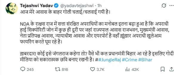 ਇਸ ਘਟਨਾ ਨੂੰ ਲੈ ਕੇ ਤੇਜਸਵੀ ਯਾਦਵ (Tejashwi Yadav) ਨੇ ਸੋਸ਼ਲ ਮੀਡੀਆ ‘ਤੇ ਪੋਸਟ ਕਰਕੇ ਸੂਬਾ ਸਰਕਾਰ ‘ਤੇ ਸ਼ਬਦੀ ਹਮਲਾ ਬੋਲਿਆ ਹੈ। ਤੇਜਸਵੀ ਯਾਦਵ ਨੇ ਲਿਖਿਆ ਹੈ ਕਿ – ਅੱਜ ਮੇਰੇ ਘਰ ਦੇ ਬਾਹਰ ਗੋਲੀ ਚਲਾਈ ਗਈ ਹੈ। ਐਨਡੀਏ ਦੇ ਰਾਖਸ਼ ਸ਼ਾਸਨ ‘ਚ ਸਰਕਾਰ ਦੁਆਰਾ ਸੁਰੱਖਿਅਤ ਅਪਰਾਧੀਆਂ ਦਾ ਮਨੋਬਲ ਇੰਨਾ ਉੱਚਾ ਹੈ ਕਿ ਉੱਚ ਸੁਰੱਖਿਆ ਜ਼ੋਨ ‘ਚ, ਰਾਜਪਾਲ ਨਿਵਾਸ ਰਾਜ ਭਵਨ, ਮੁੱਖ ਮੰਤਰੀ ਨਿਵਾਸ, ਵਿਰੋਧੀ ਧਿਰ ਦੇ ਆਗੂ ਦੇ ਨਿਵਾਸ, ਜੱਜ ਦੇ ਨਿਵਾਸ ਅਤੇ ਹਵਾਈ ਅੱਡੇ ਤੋਂ ਥੋੜ੍ਹੀ ਦੂਰੀ ‘ਤੇ, ਭਿਆਨਕ ਅਪਰਾਧੀ ਖੁੱਲ੍ਹੇਆਮ ਗੋਲੀਆਂ ਚਲਾ ਰਹੇ ਹਨ। ਖ਼ਬਰਦਾਰ ! ਜੇ ਕੋਈ ਇਸ ਨੂੰ ਜੰਗਲ ਰਾਜ ਕਹੇ ਤਾਂ ? ਵੈਸੇ ਵੀ, ਪ੍ਰਧਾਨ ਮੰਤਰੀ ਕੱਲ੍ਹ ਬਿਹਾਰ ਆ ਰਹੇ ਹਨ |