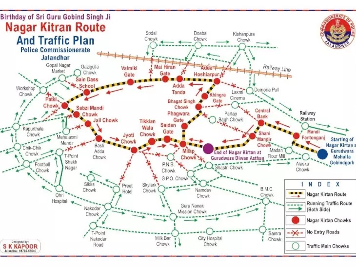 ਨਗਰ ਕੀਰਤਨ ਸ਼੍ਰੀ ਗੁਰੂ ਸਿੰਘ ਸਭਾ ਮੁਹੱਲਾ ਗੋਬਿੰਦਗੜ੍ਹ ਜਲੰਧਰ ਤੋਂ ਸ਼ੁਰੂ ਹੋ ਕੇ ਐਸ.ਡੀ.ਕਾਲਜ, ਭਾਰਤ ਸੋਡਾ ਫੈਕਟਰੀ, ਰੇਲਵੇ ਰੋਡ, ਮੰਡੀ ਫੈਂਟਗੰਜ, ਗੁਰਦੁਆਰਾ ਦੀਵਾਨ ਅਸਥਾਨ ਸੈਂਟਰਲ ਟਾਊਨ, ਮਿਲਾਪ ਚੌਕ, ਫਗਵਾੜਾ ਗੇਟ, ਸ਼ਹੀਦ ਭਗਤ ਸਿੰਘ ਚੌਕ, ਪੰਜ ਪੀਰ ਸਿੰਘ ਸਭਾ ਹੋਦੜ, ਸ੍ਰੀ ਗੁਰੂ ਸਭਾ ਚੌਂਕ, ਸ੍ਰੀ ਗੁਰੂ ਗ੍ਰੰਥ ਸਾਹਿਬ ਚੌਂਕ, ਖੱਡਪੁਰ ਹੁੰਦਾ ਹੋਇਆ ਸਮਾਪਤ ਹੋਵੇਗਾ। ਮਾਈ ਹੀਰਨ ਗੇਟ, ਭਗਵਾਨ ਵਾਲਮੀਕੀ ਗੇਟ, ਪਟੇਲ ਚੌਕ, ਸਬਜ਼ੀ ਮੰਡੀ ਚੌਕ, ਜੇਲ੍ਹ ਚੌਕ, ਬਸਤੀ ਅੱਡਾ ਚੌਕ, ਭਗਵਾਨ ਵਾਲਮੀਕੀ ਚੌਕ (ਜੋਤੀ ਚੌਕ), ਰੈਣਕ ਬਾਜ਼ਾਰ, ਮਿਲਾਪ ਚੌਕ।